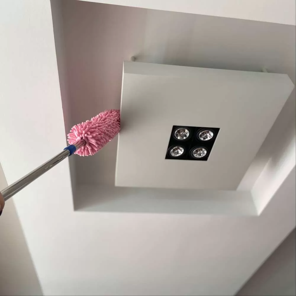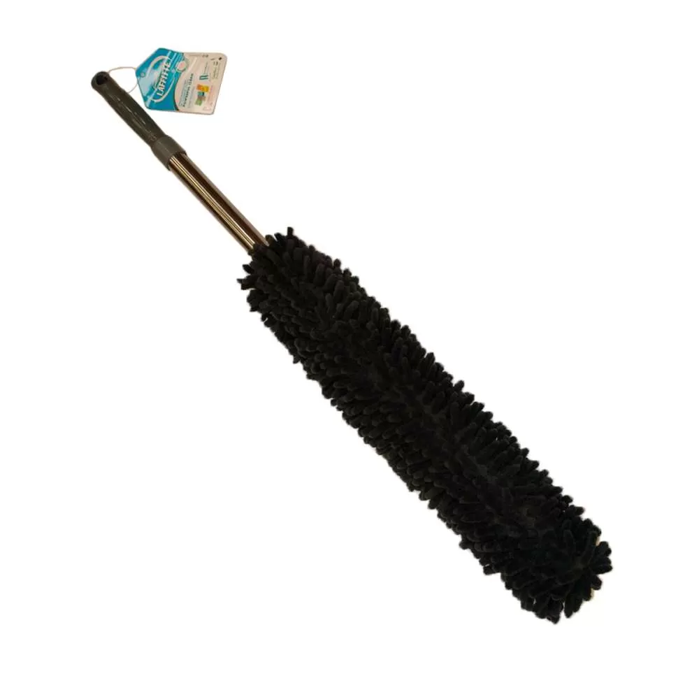 Plumero de microfibra con extensiones de chenille en 360° y cabo extensible, ideal para limpiar zonas altas sin esfuerzo.